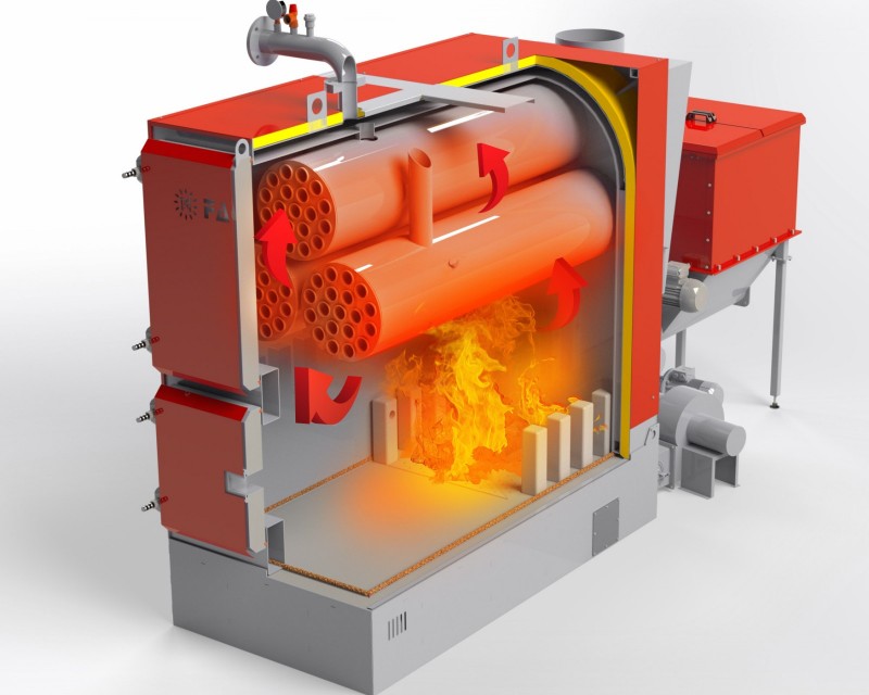 Котел на щепе FACI FSS с уникальным трехциллиндровым высокоэффективным теплообменником разработан для отопления объектов инфраструктуры  с использованием в качестве топлива щепы с естественной влажностью.