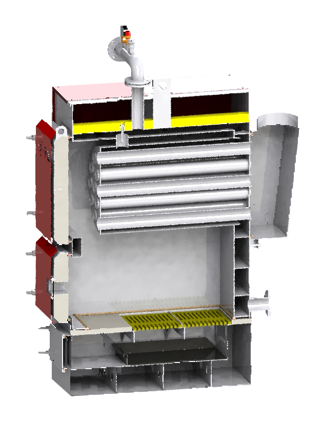 • горизонтальный жаротрубный теплообменник, находящийся непосредственно над зоной основного горения, для того, чтобы дымовые газы могли как можно дольше задержаться в теплообменнике и передать максимум тепла - благодаря этому решению КПД котлов достигает 85%.