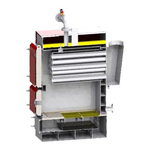 • горизонтальный жаротрубный теплообменник, находящийся непосредственно над зоной основного горения, для того, чтобы дымовые газы могли как можно дольше задержаться в теплообменнике и передать максимум тепла - благодаря этому решению КПД котлов достигает 85%.