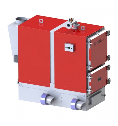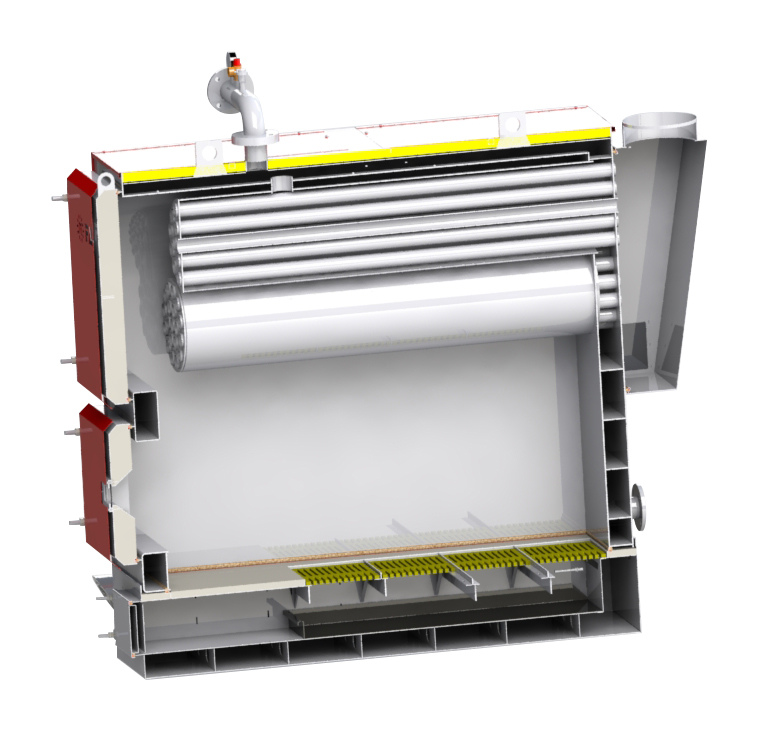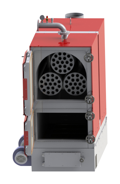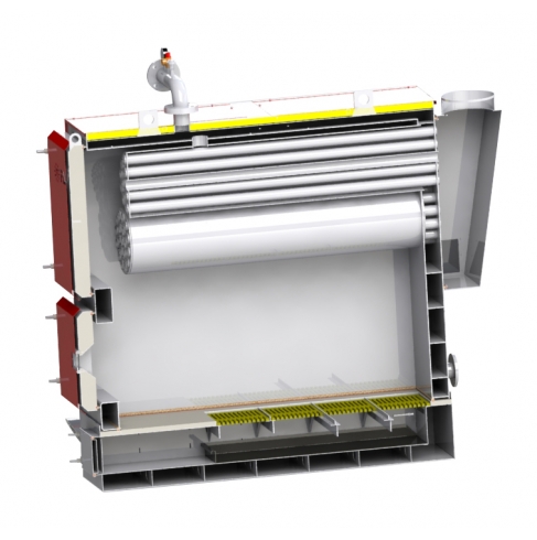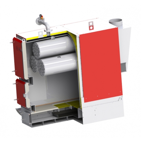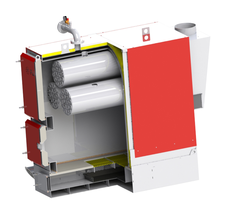 • горизонтальный жаротрубный теплообменник, находящийся непосредственно над зоной основного горения, для того, чтобы дымовые газы могли как можно дольше задержаться в теплообменнике и передать максимум тепла - благодаря этому решению КПД котлов достигает 85%.