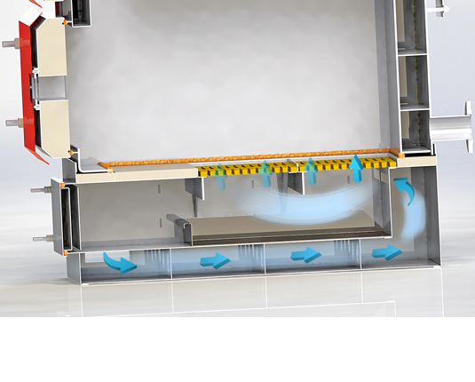 В дальнейшем, воздух проходит через колосниковую решетку и поддерживает горение топлива в самом эпицентре котла – под теплообменником.